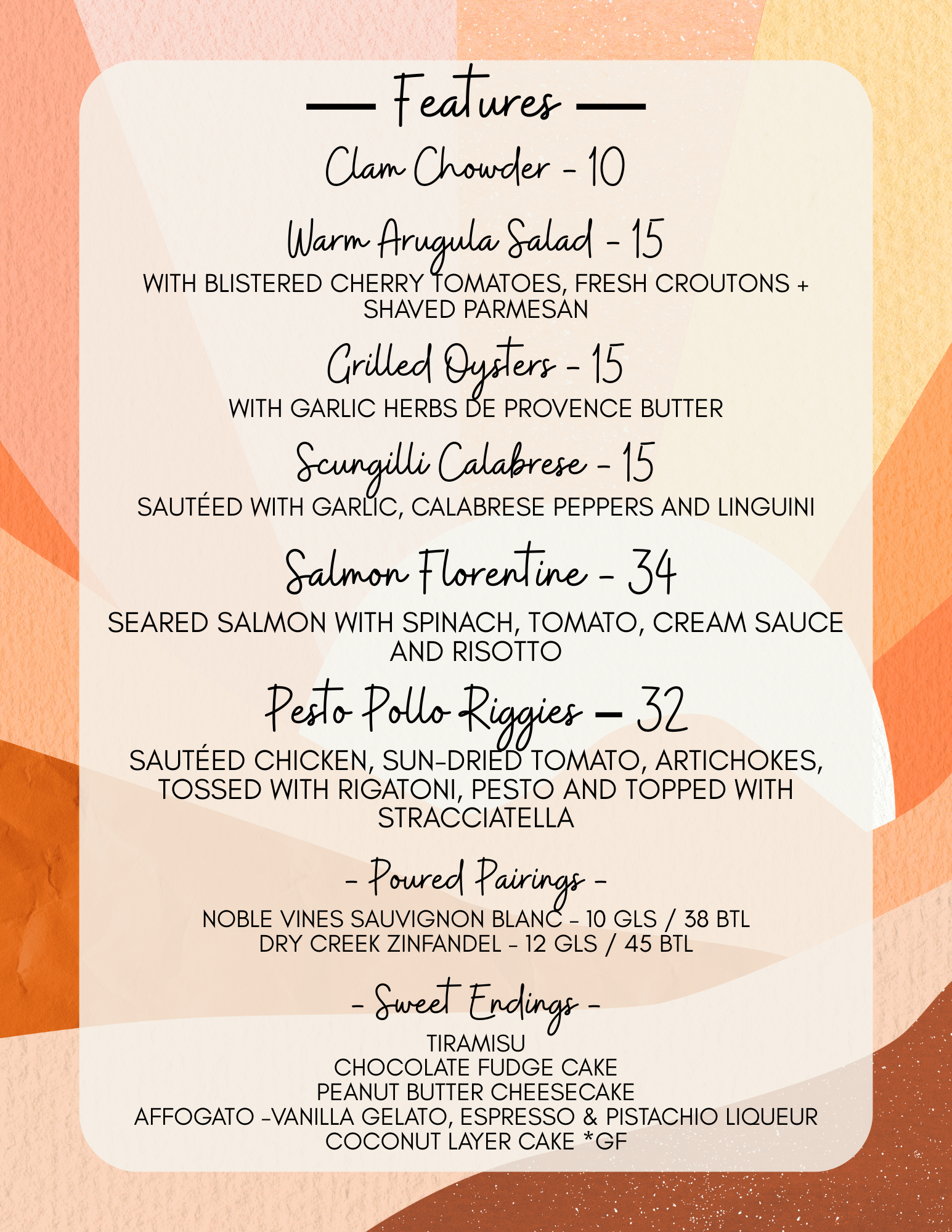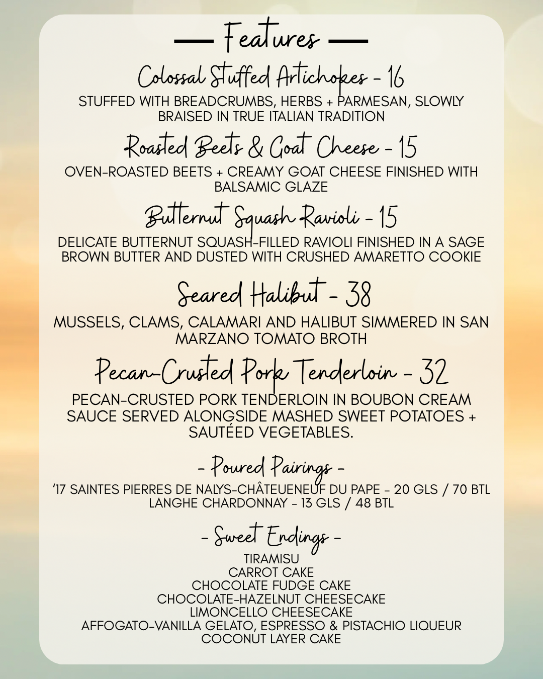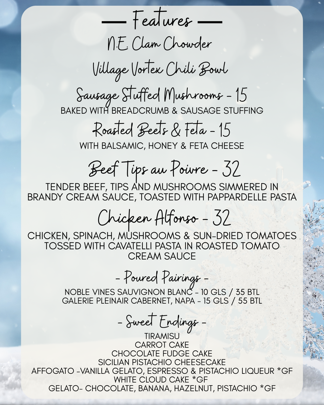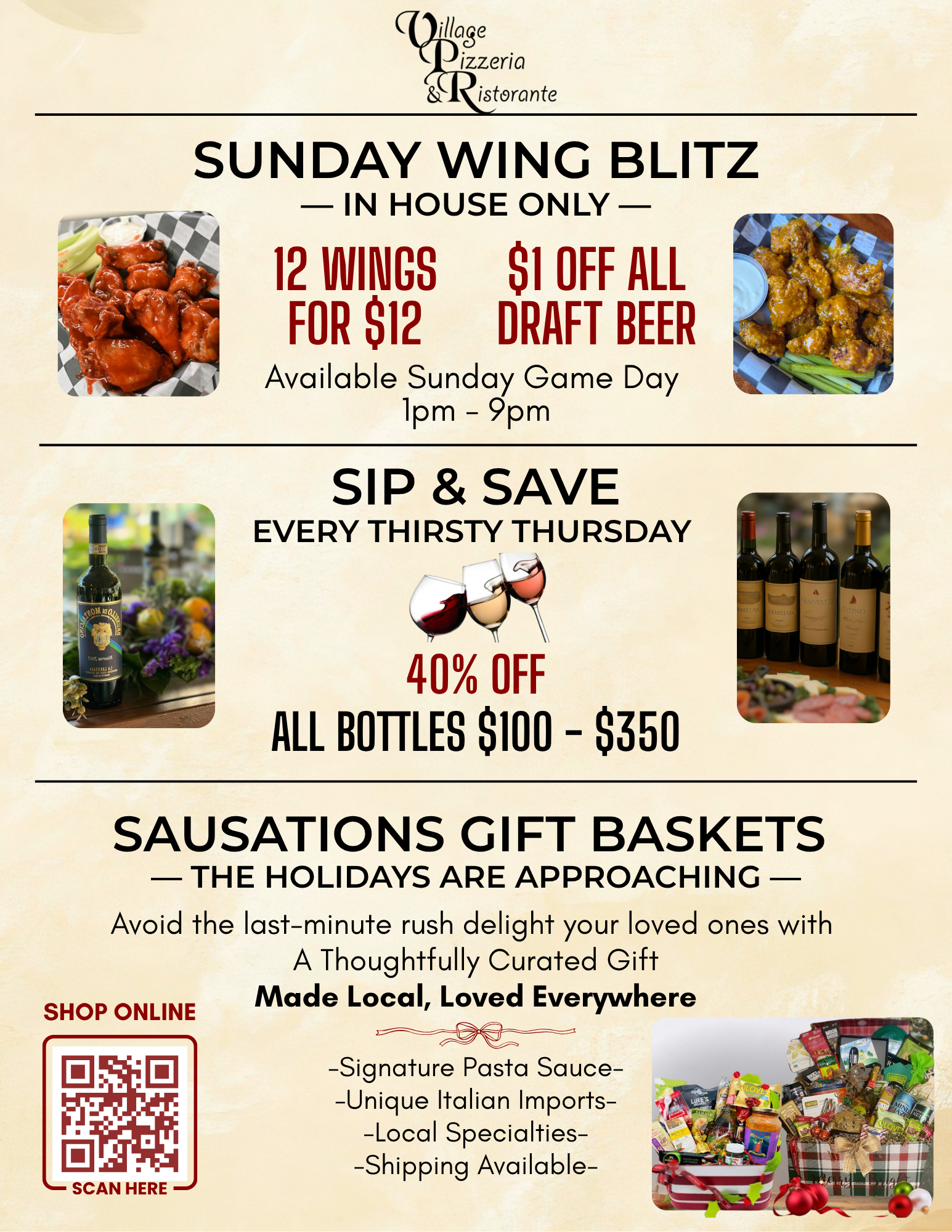 Here we try to offer our customers something that they won’t experience anywhere else, a harmonic pairing of food and wine that tantalizes tastes buds. We educate and inform our customers with regular wine tastings and other charitable social gatherings that always seem to revolve around our love of wine. The days of the snobby sommelier are over. Today’s wine specialist is younger, better educated and more enthusiastic than ever. Our wine program at the Village Pizzeria is a direct reflection of the passion we feel for food and wine, and it is so fulfilling for us to share that with everyone we meet.